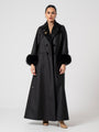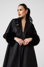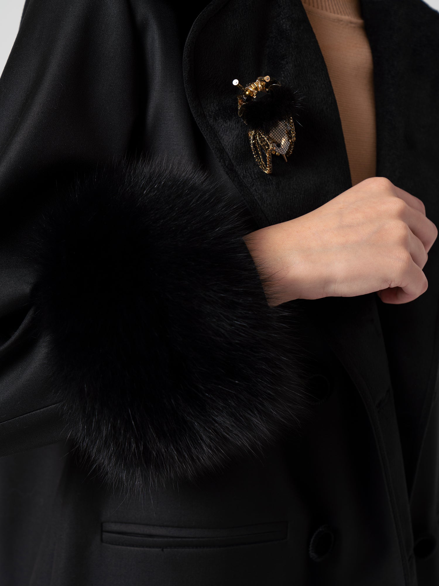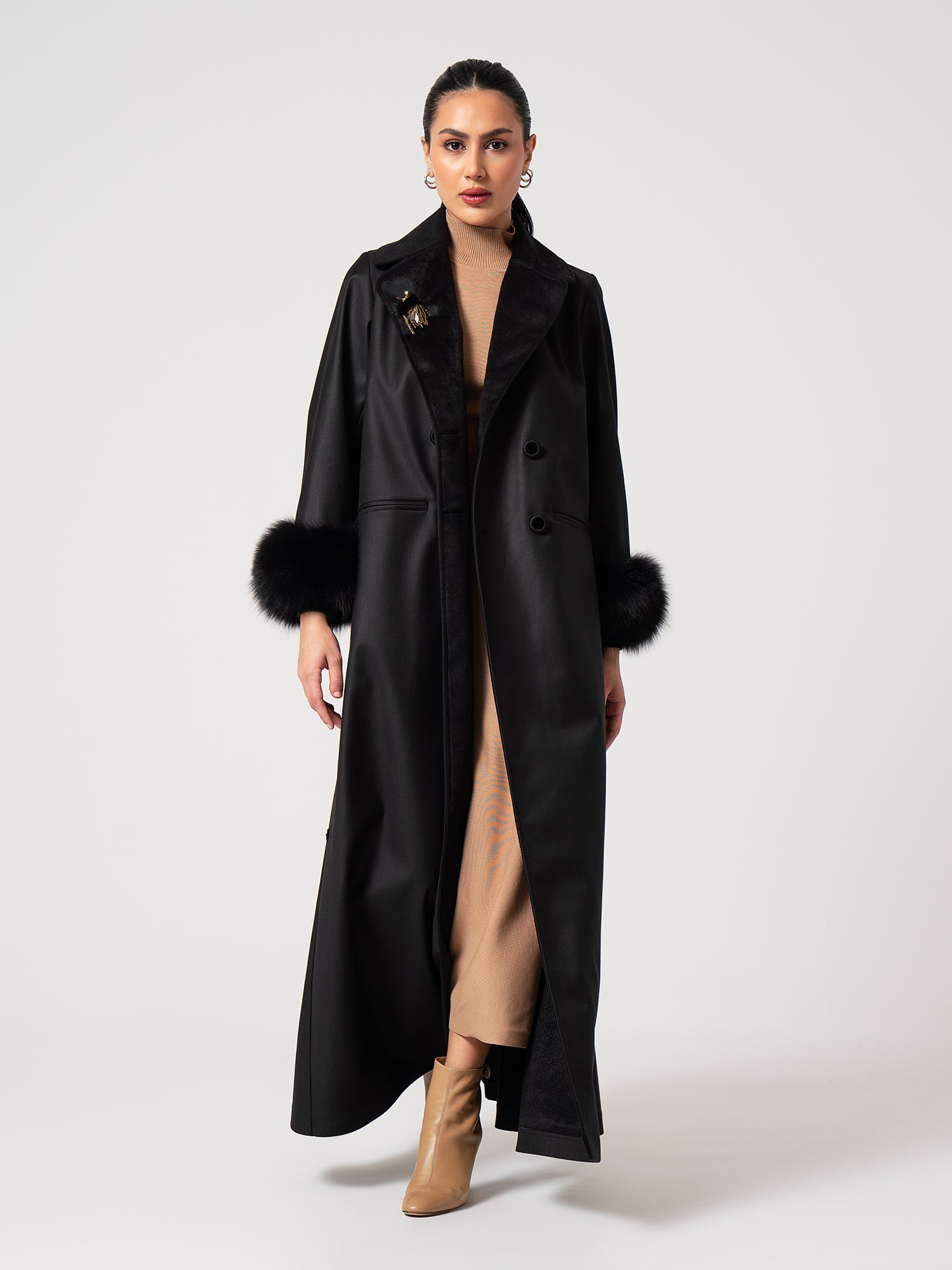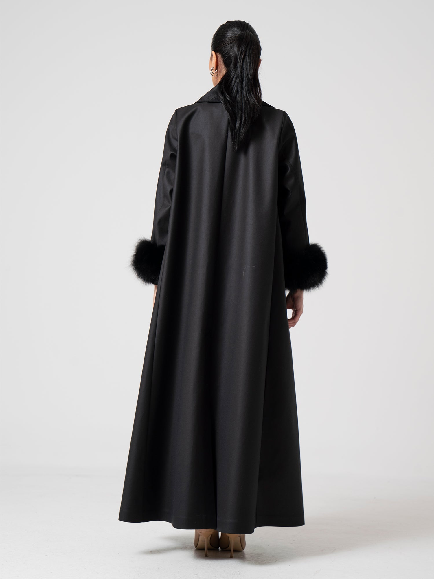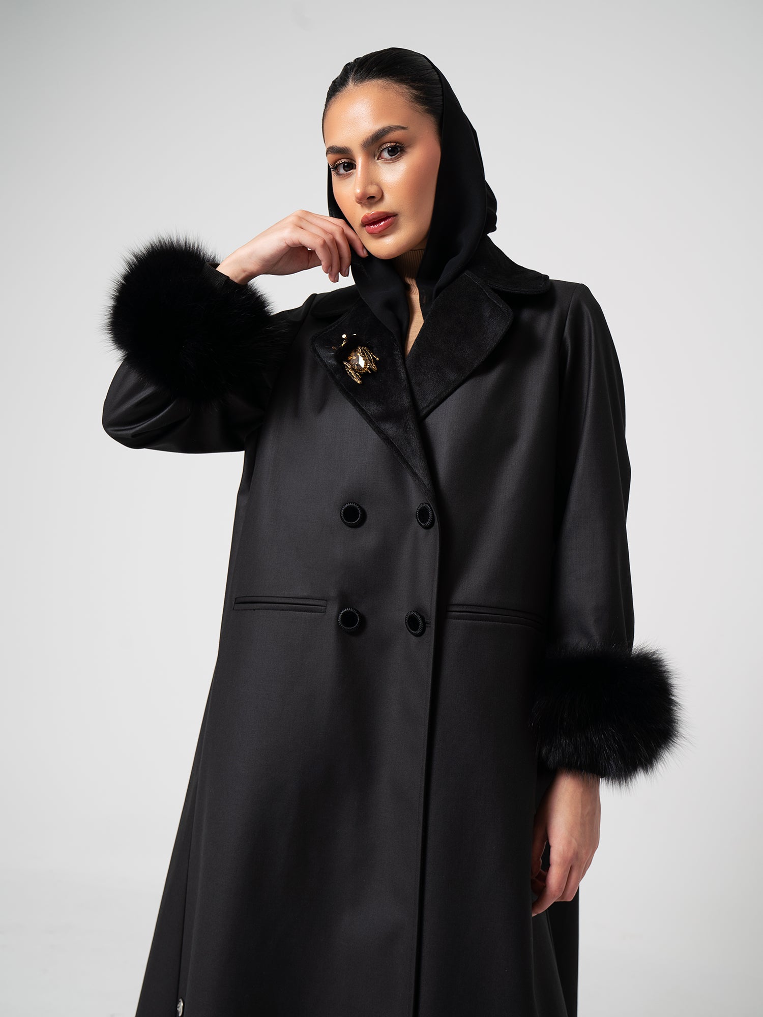 صُنعت هذه العباءة المصممة على شكل معطف من الصوف المخلوط، وتتميز بأساور من فرو الثعلب الفاخر، وتصميم منظم، ودبوس مميز لإطلالة أنيقة وراقية في الشتاء.