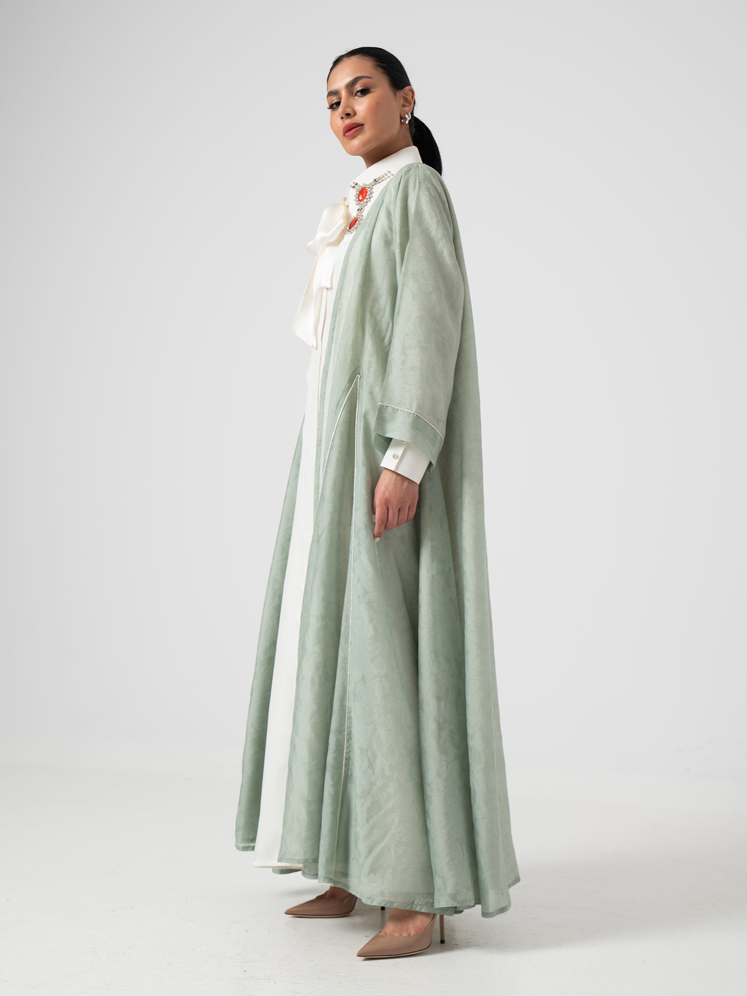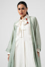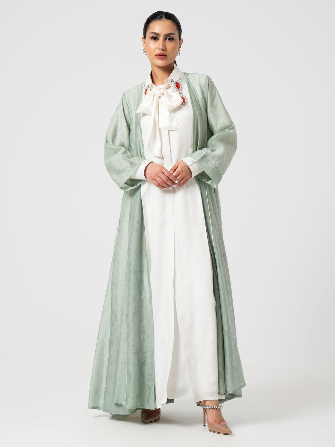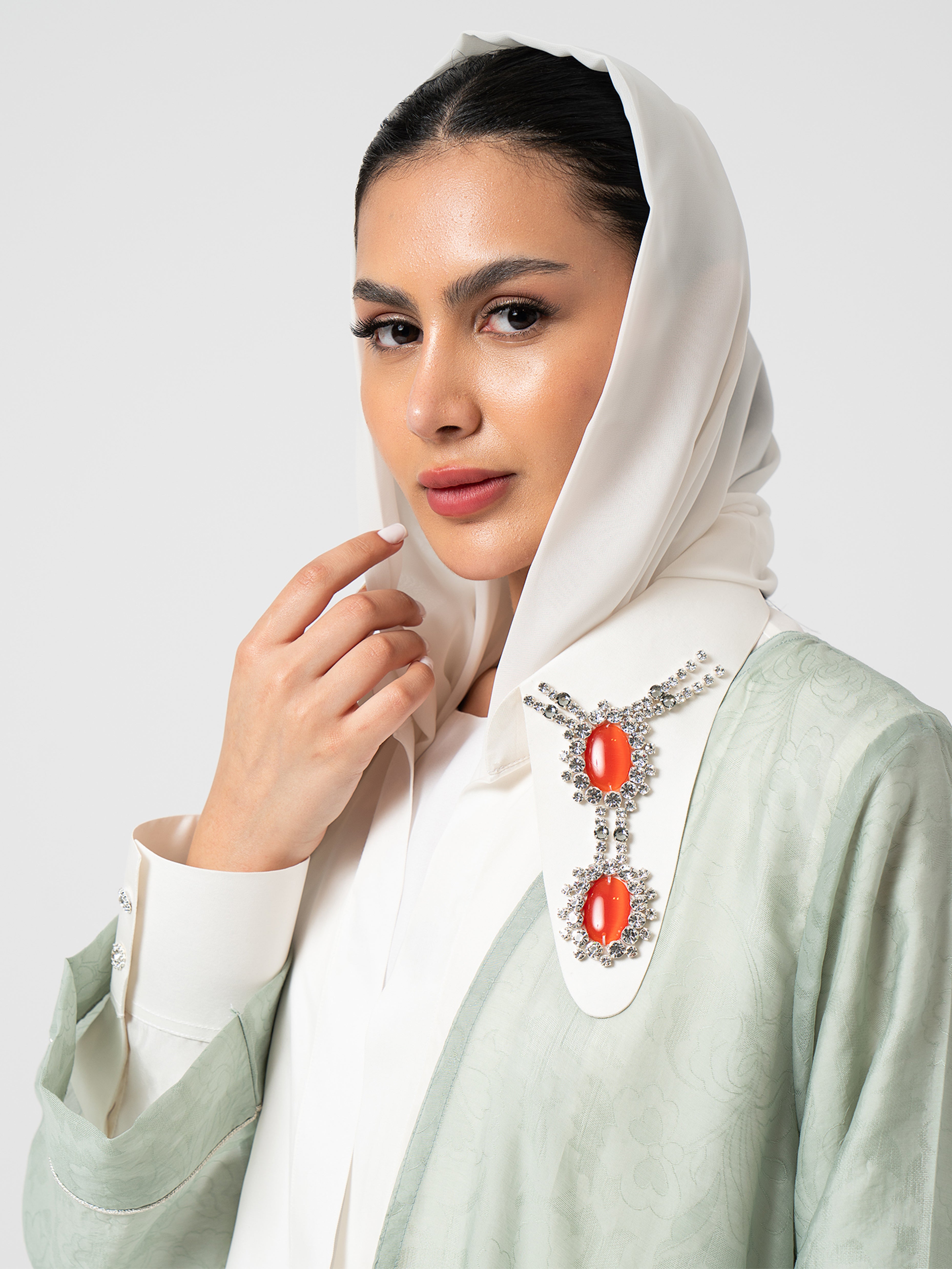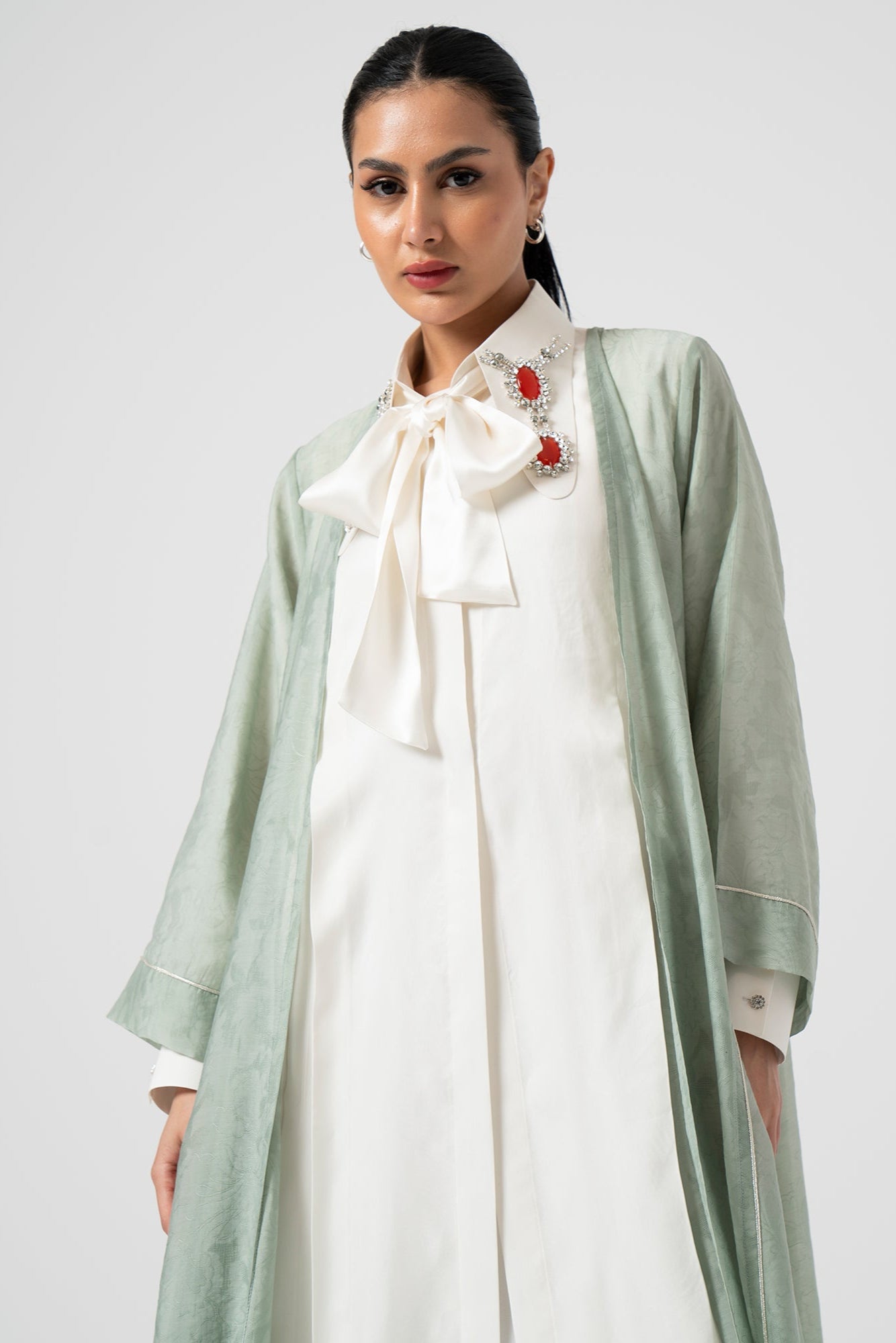 Crafted from the finest washed silk and chiffon, adorned with subtle crystals and a silk bow detail on the collar.