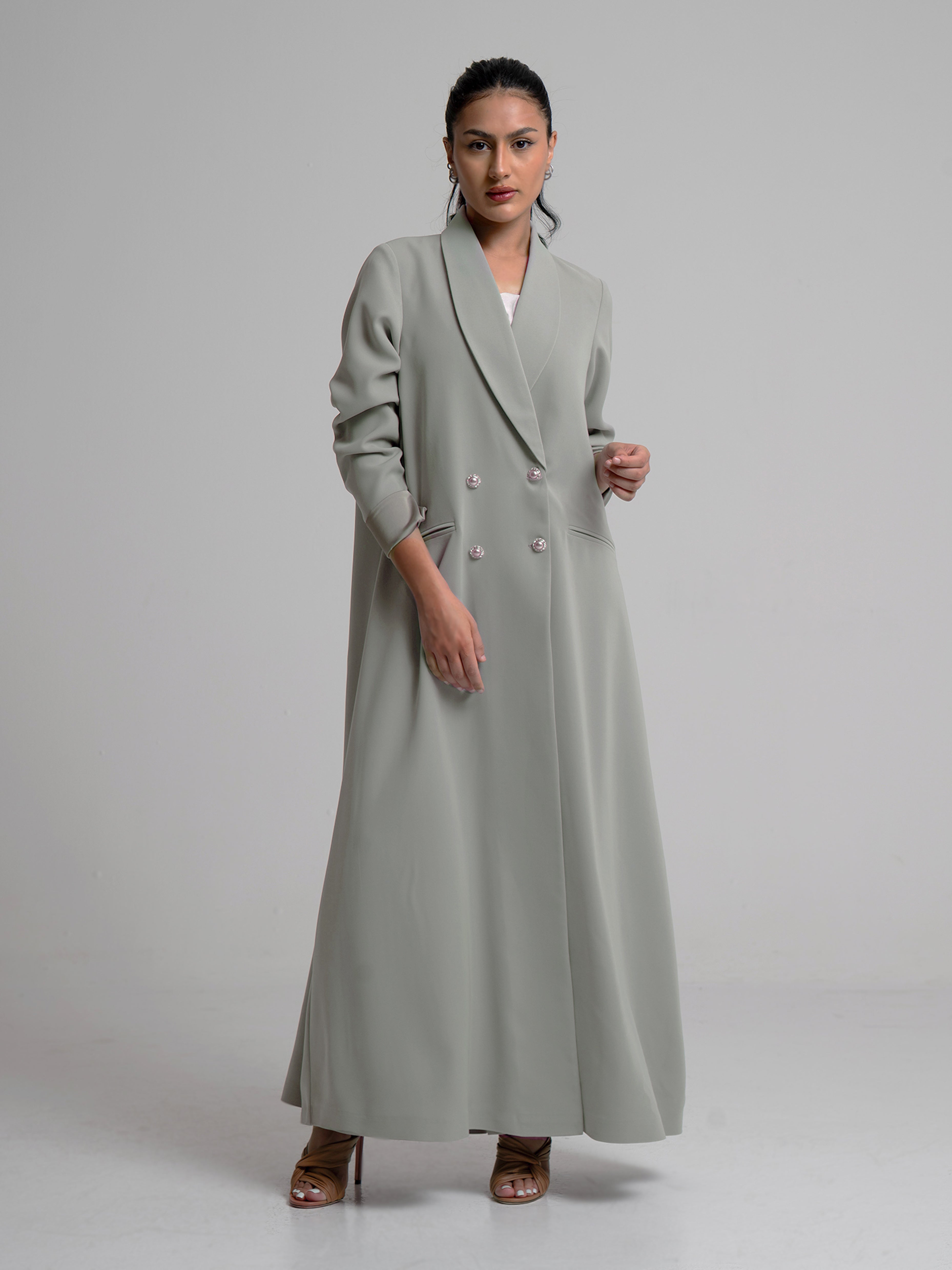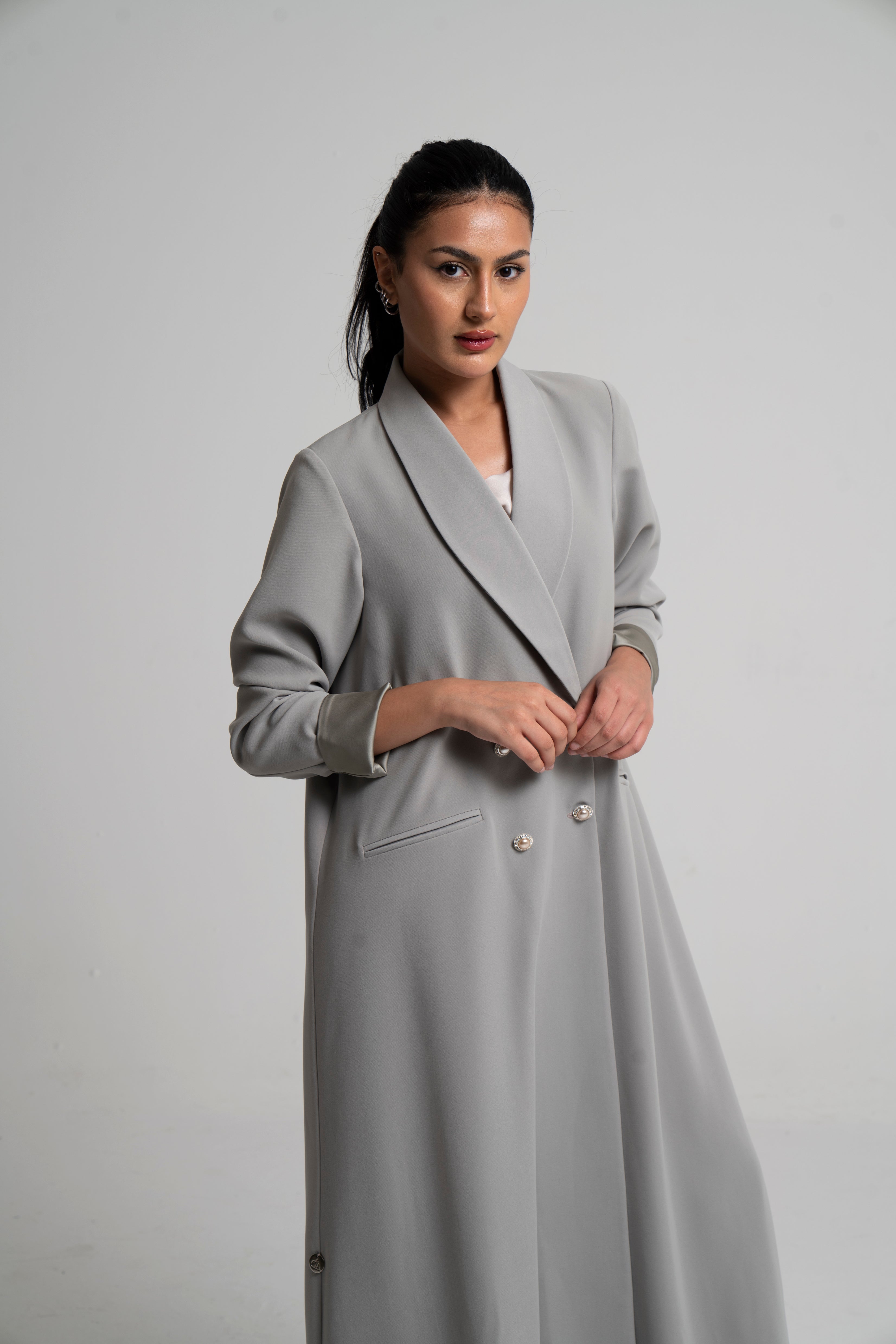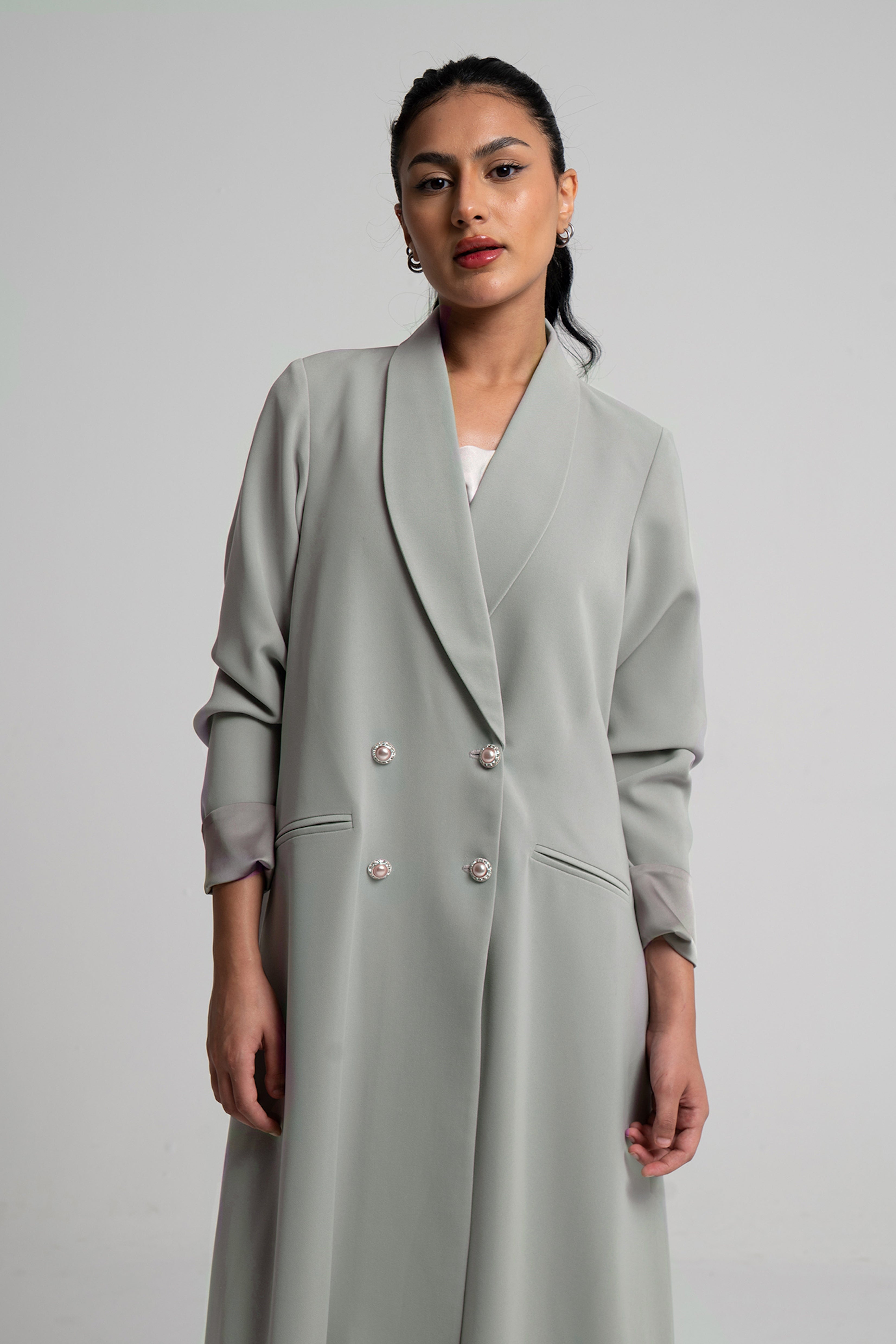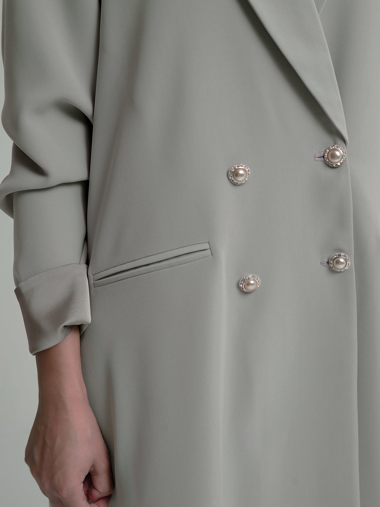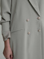 Crafted from structured crepe, featuring a sleek double-breasted design with elegant pearl buttons for a refined, sophisticated touch.