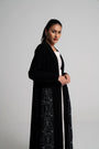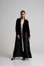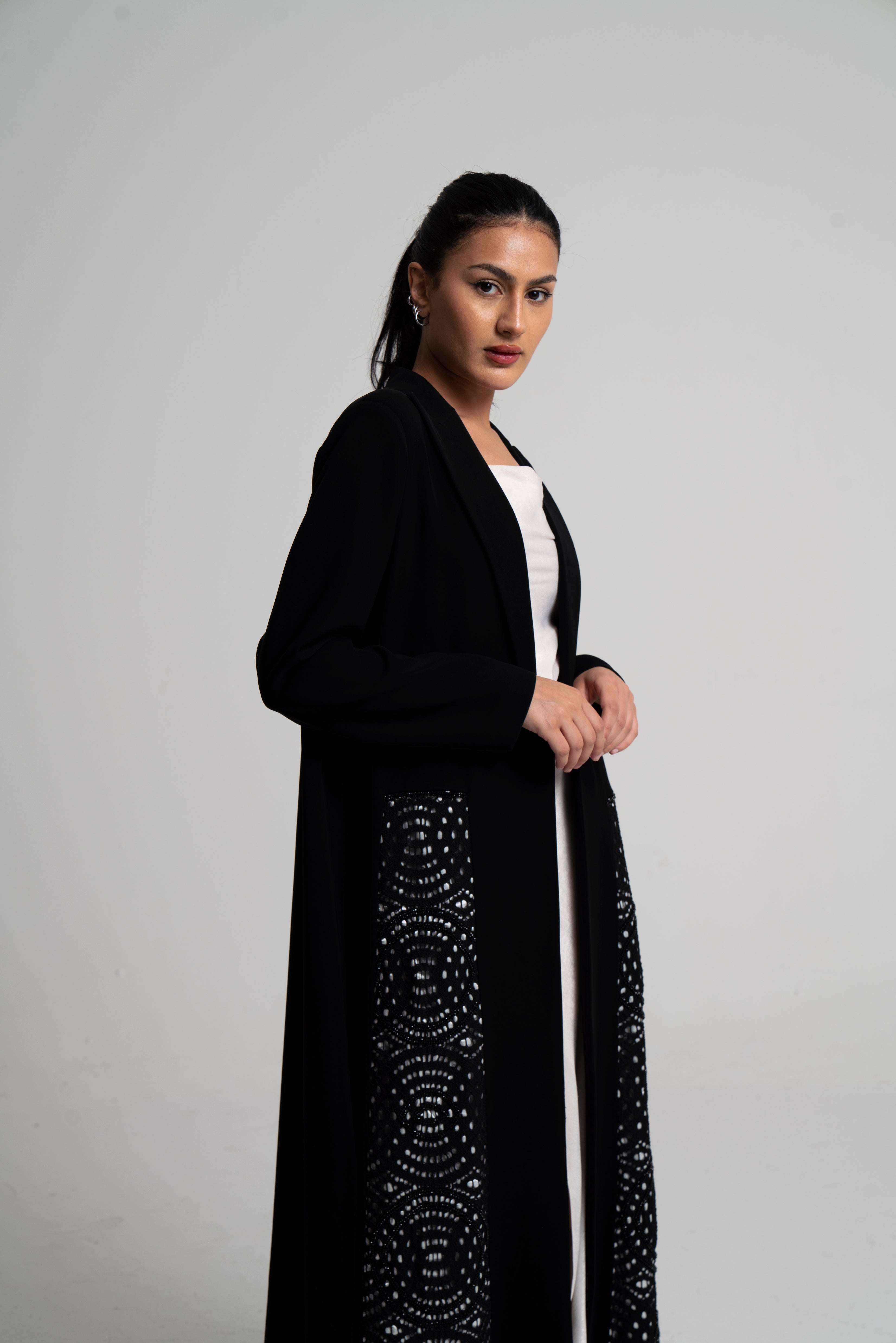 Crafted from luxurious crepe, featuring beaded dantelle panels that add a touch of intricate elegance to your ensemble.
