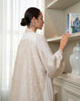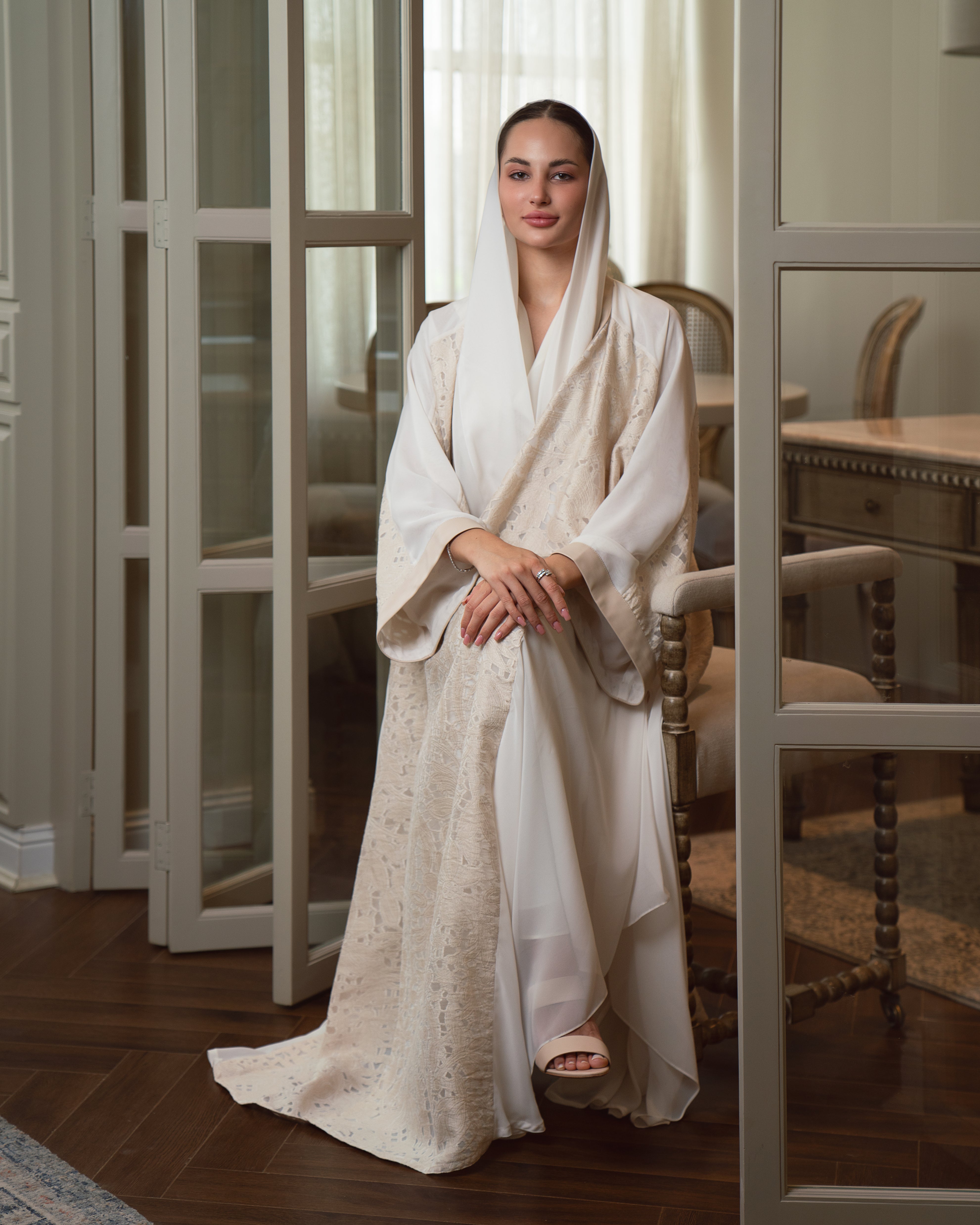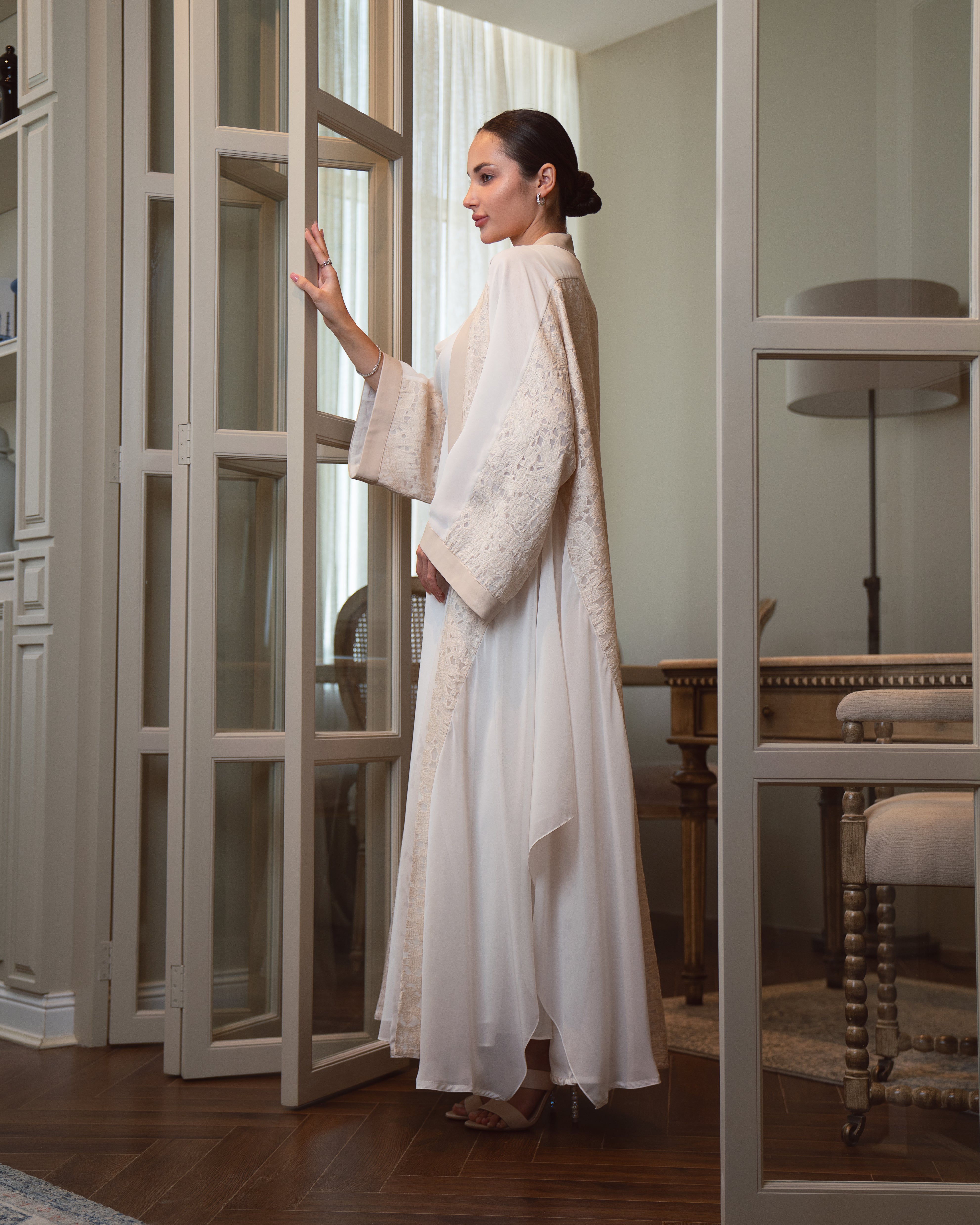 Luxurious chiffon and lace abaya with modern leather accents, creating a sophisticated and ethereal silhouette.