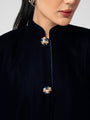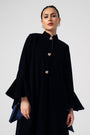 Crafted from plush velvet, this abaya features statement bell sleeves, a silk-lined interior, and exquisite pearl-embellished buttons for a regal, refined finish.