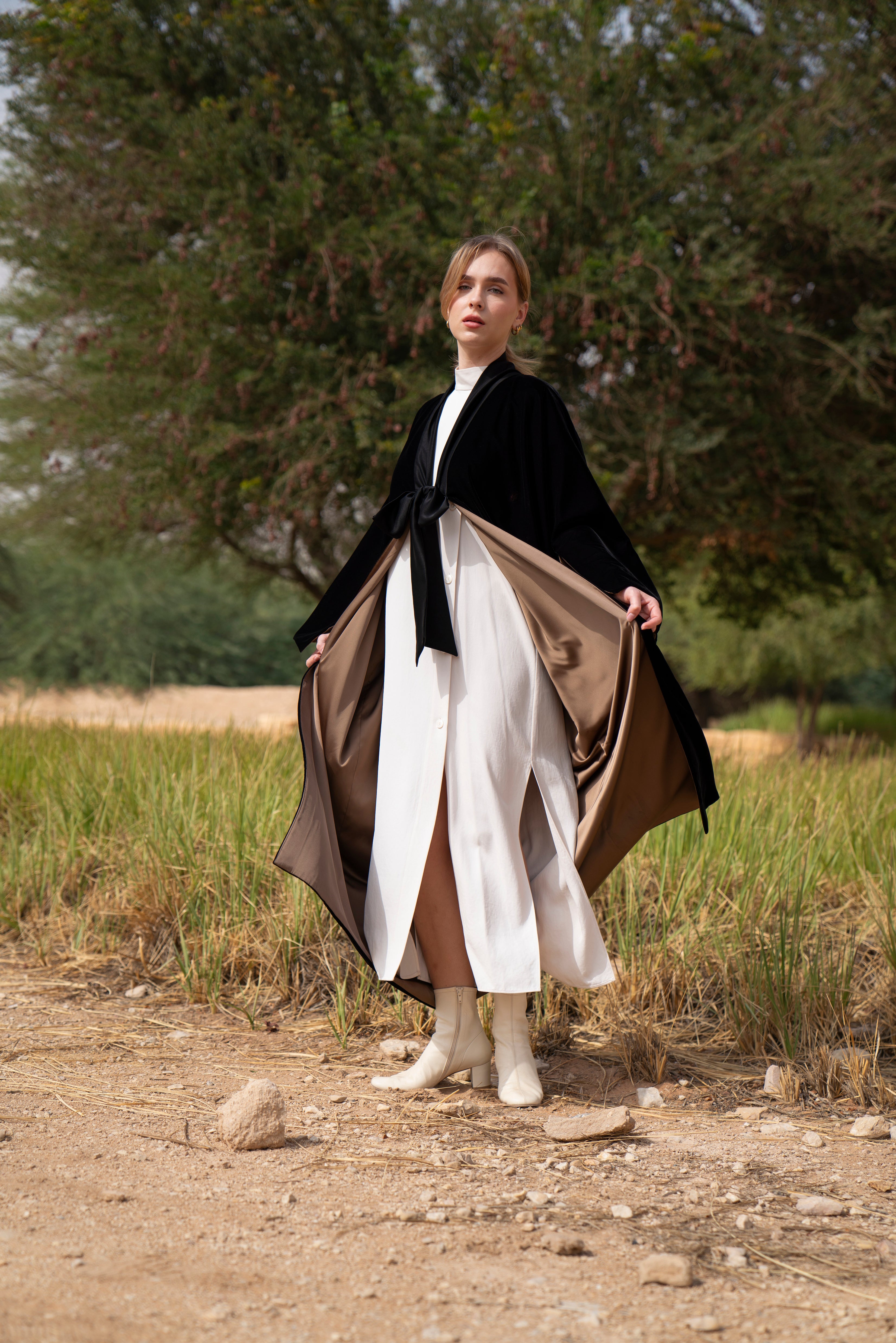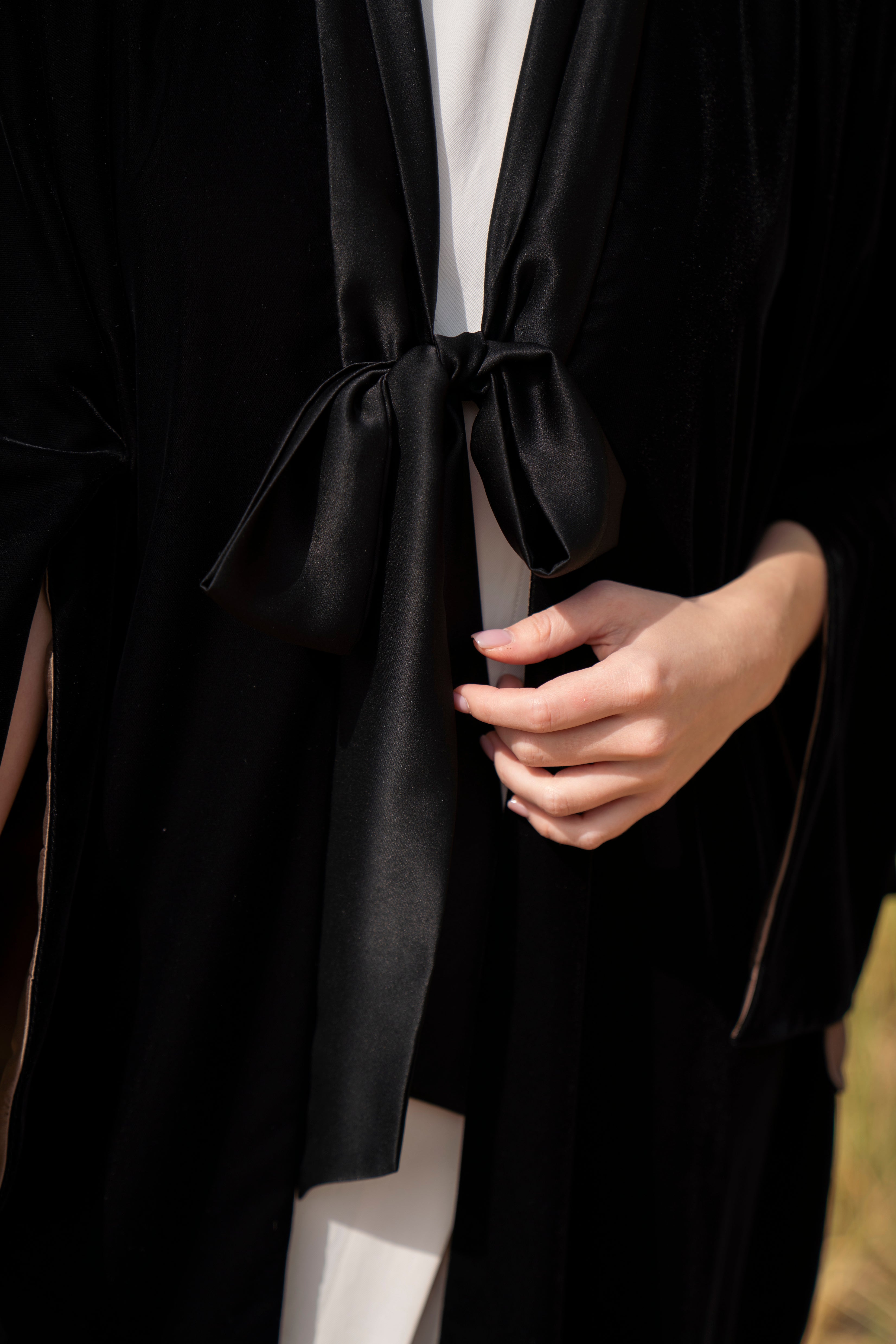 Comfortable mid-weight velvet abaya with a luxurious silk lining, offering elegance and refined comfort.